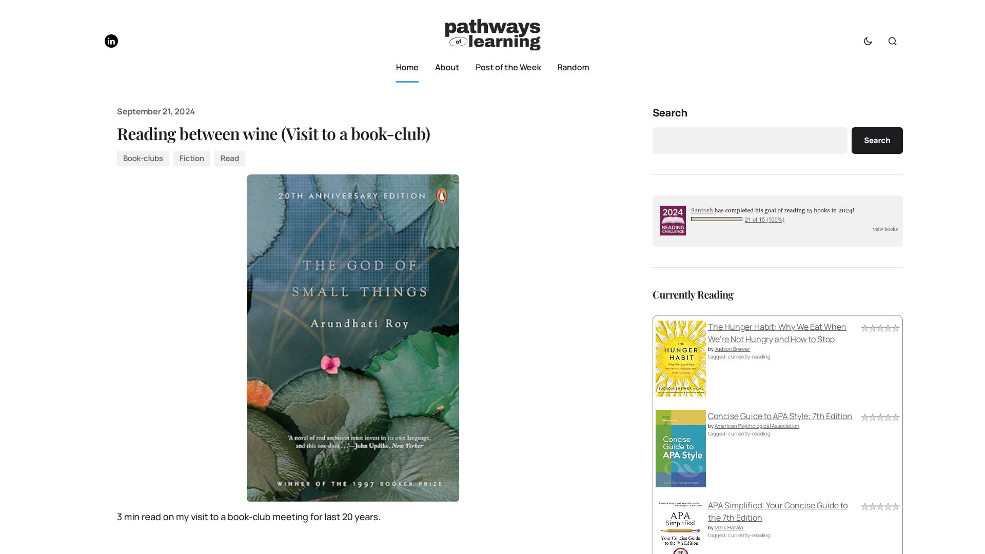 One of the most significant challenges was maintaining Dr. Santosh’s desire for a minimalist design while incorporating the new features like a "Post of the Week" section, a random post button, and the reading challenge widget. These elements needed to blend seamlessly into the site without disrupting its clean, writing-focused aesthetic. Ensuring that these features were both functional and aesthetically subtle required careful design decisions.